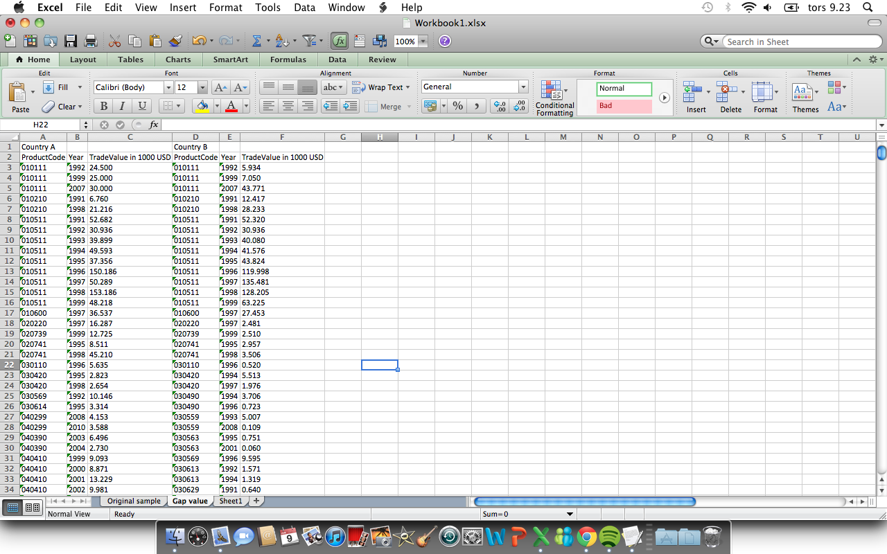 在下面链接中的示例中,我手动完成了这一操作,直到第22行(除减去贸易数字外)。例如,下面第(23)行说,产品030420在1995年的交易价值为2.823,但该年该产品的交易没有记录在B国,因此我希望删除该邮件。相应地,在B国,产品030420的贸易记录在1994年,但在A国没有对应的,因此该职位也应删除。