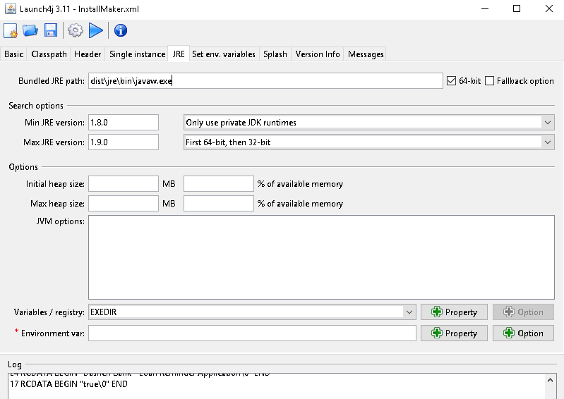 |- bin (my application with the .exe and the .jar and all the other stuff)在launch4j的xml文件中,我按如下方式配置jre: