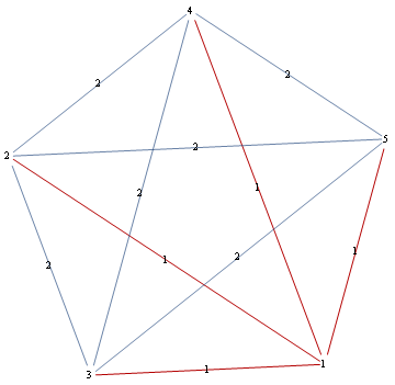 adj = {{\[Infinity], 1, 1, 1, 1}, {1, \[Infinity], 2, 2, 2},