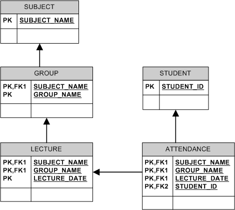 这个ER模型使用了大量的标识关系(即“迁移”父母的主键到子的PK),并导致自然的主键,而不是需要使用代理键的非标识关系。现在很多人都喜欢代孕钥匙,但事实是,这两种设计策略都有优缺点。特别是: