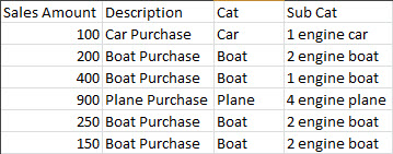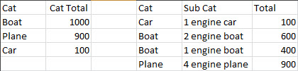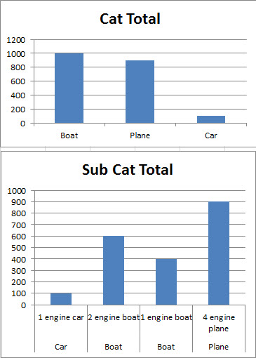 一种解决方案是在“值”中使用枢轴图,在“行标签”中使用“类别”,在“列标签”中使用SubCategory。
