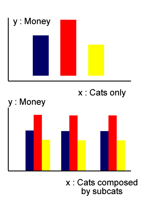 最后,但并非最不重要的是,我看到了一些图表,其中,这些独特的-不是重复的类别,而不是只是一个单一的‘酒吧’,可以说,是由较小的酒吧组成。在本例中,我希望将这些较小的条作为子类别,以便最终结果如下所示: