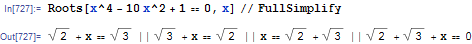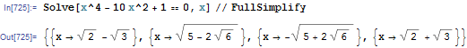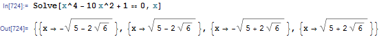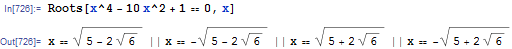 Out[53]= {{x->-Sqrt[5-2 Sqrt[6]]},{x->Sqrt[5-2 Sqrt[6]]},{x->-Sqrt[5+2 Sqrt[6]]},{x->Sqrt[5+2 Sqrt[6]]}}