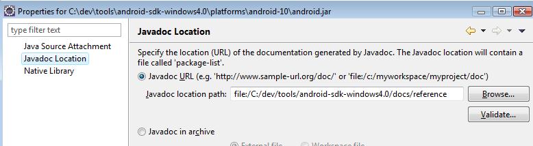 我已经用Android2.3.3jar构建了这个项目,javadoc属性显示了
