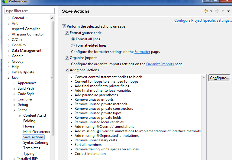 我已经为eclipse定义了某些代码格式规则并保存操作(如所附图像所示)。我遇到了本教程,它允许我使用org.eclipse.jdt.core.JavaCodeFormatter从命令行格式化代码。有人能告诉我,我可以从命令行中使用哪个eclipse类来调用保存操作功能。