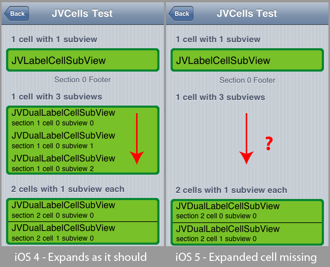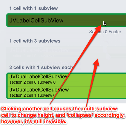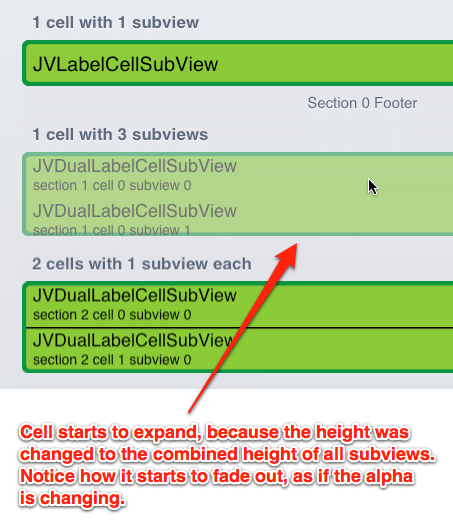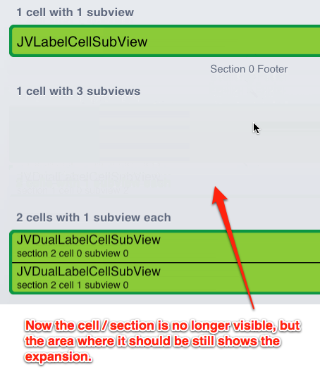 我要做的是展开一个单元格,而不是替换、插入或删除单元格。每个单元格都有一个或多个子视图。单元格的高度取决于它是否“展开”。content视图中添加了子视图,并且它的clipToBounds属性是肯定的。当单元格展开或折叠时,高度值随单元格的帧(包括背景视图和选定的背景视图)而变化。在展开之前、期间和之后,我记录了所有的帧值,它们都与它们的状态和位置一致。