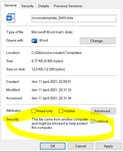 检查word文档的属性,并确保文件已解除阻塞。有时,当您从另一台计算机获取文档或从internet下载文档时,它们会被阻塞,从而导致抛出此异常“无法打开宏存储”。