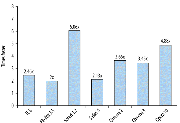 对这两段代码进行比较表明,在浏览器之间使用选择器API要快2到6倍(图3-6)。