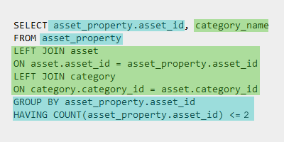 我希望为具有2个或更少属性的资产(在asset_id表中有2行或更少的行)选择category_name、category_name和Fixture ID。到目前为止,我只有asset_id和category_name。并不是所有资产都存在Fixture ID。如果是这样的话,它将是与property_id 1同一行的property_id 1。