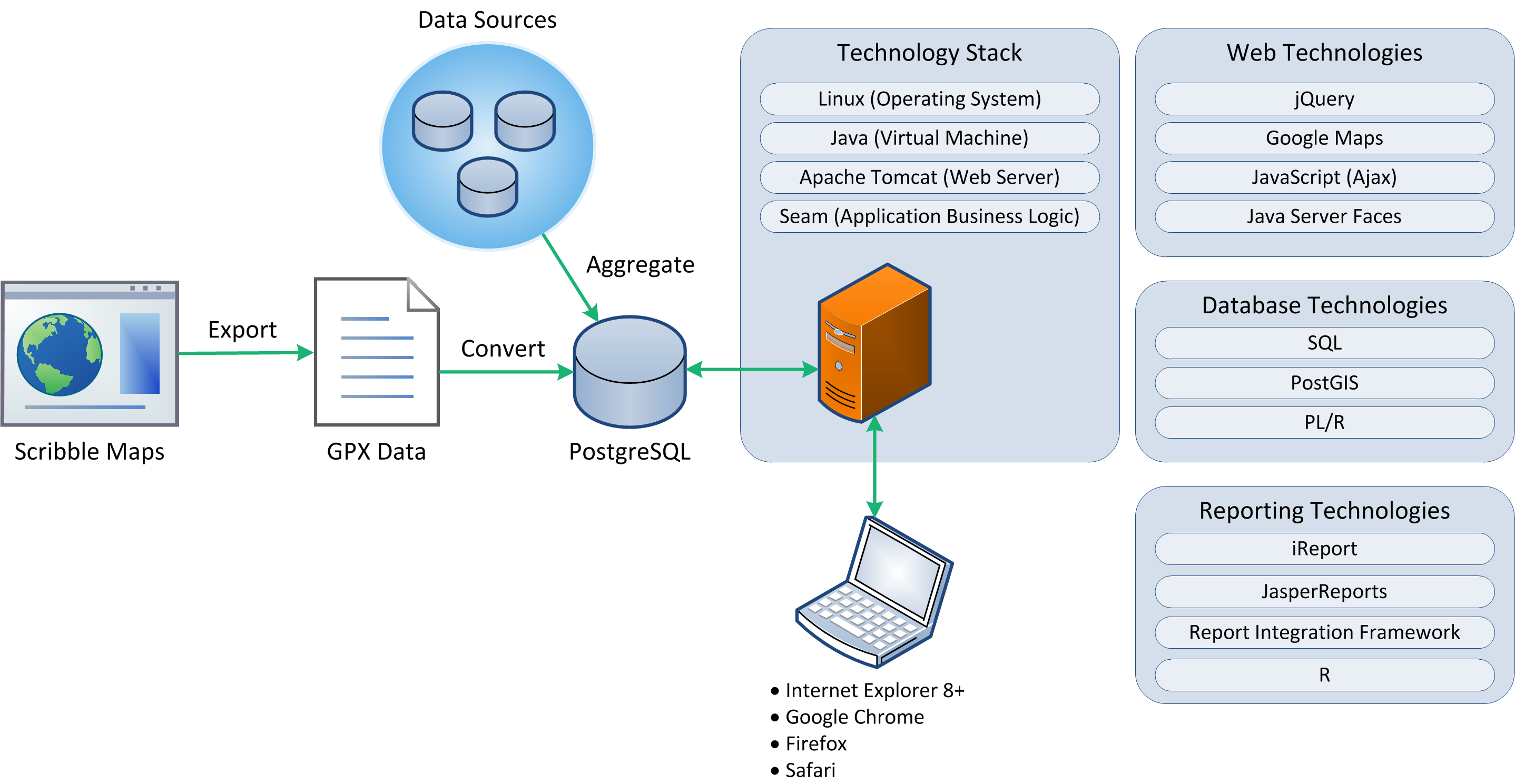 在概念上,我正在寻找一个工具,或一套软件工具,可以很容易地集成,以帮助浏览数据使用基于地理信息系统的地图(如谷歌地图)。拟议的架构类似但不限于以下方面: