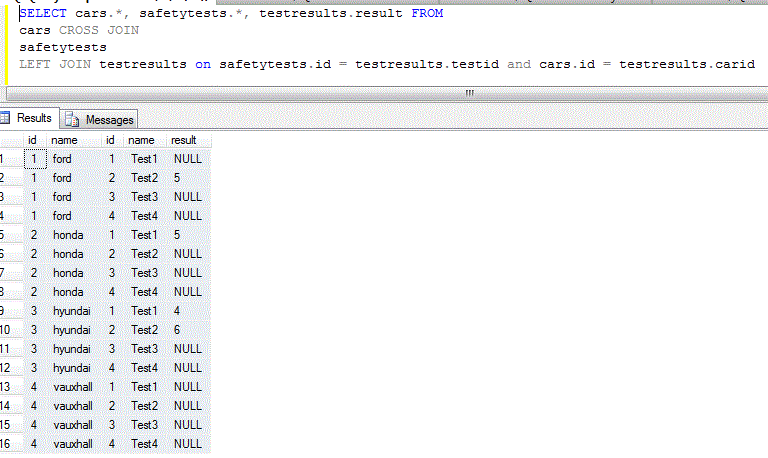 LEFT JOIN testresults on safetytests.testid = testresults.testid AND car.id = testresults.carid