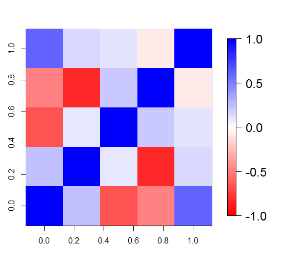 image(cor(matrix(rnorm(400), nrow=20)), axes=F)