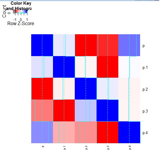 热图2(样本,树状图=‘none’,symm=TRUE,Rowv=FALSE,Colv=FALSE,key=TRUE,cexCol=0.7,cexRow=1,scale="row",keysize=1,col=redblue(191),breaks=shades)