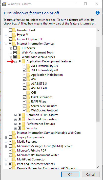 默认情况下,IIS不安装所有必需的功能。