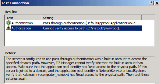 刚才我也有同样的问题;正如您刚才提到的,我尝试了"Connect As“,并且我写下的用户名和密码是我的机器的用户(IIS正在这台机器上运行),我测试了连接,它现在工作了。也许如果您没有使用该机器的用户(具有管理员权限的试用用户),您应该尝试一下,它对我有效,在您的情况下也可能有效。
