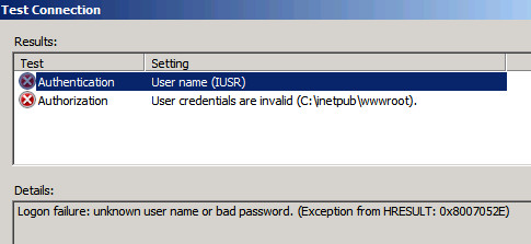 Edit Virtual Directory -> Connect As对话框中,选择Application (通过身份验证)。当我按下“测试设置”时,会得到上面的错误。Edit Virtual Directory -> Connect As对话框中,选择“特定用户:IUSR”(无密码)。当我按下测试设置时,我得到以下内容: