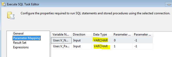 我使用了一个带有字符串数据类型的输入变量,并在Execute SQL Task中的参数映射中使用了这个变量。