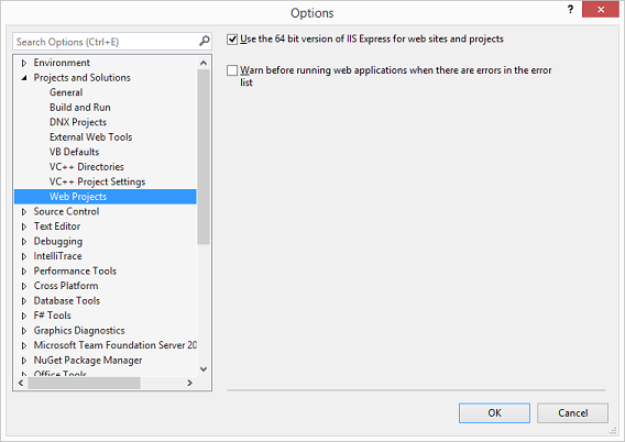 工具→选项→项目和解决方案→网络项目 选中“将IIS Express的64位版本用于网站和项目”的复选框。