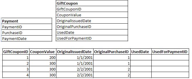 当通过礼品优惠券付款时,需要用该UsedForPaymentID更新GiftCoupon表中的PaymentID列(对于礼品优惠券ID)。