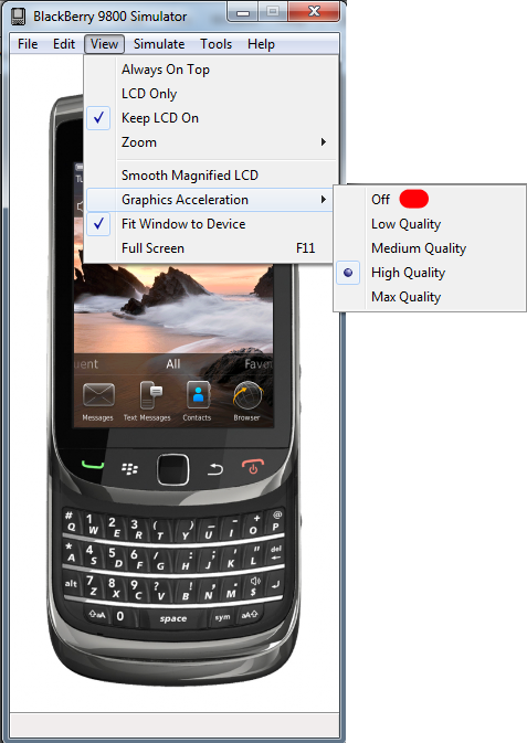 关闭图形加速。对于BlackBerry火炬9800模拟器,在哪里可以找到关闭选项(红色标记)如下图所示。在你的模拟器上试试这样的东西。
