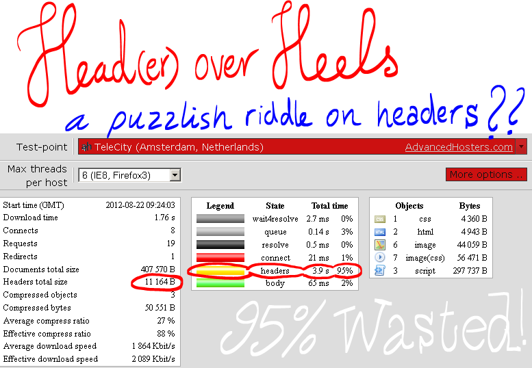 在对我的网站进行了彻底的优化(在谷歌、PageSpeed和96雅虎YSLOW上得分95 )之后,我对标题为何感到困惑?装载时间相对较长。11 KBytes头信息不正常吗?一个网站的缓慢是由标题造成的,应该如何优化?我们非常感谢对php/htaccess的建议、测试和技巧,以便找到并隔离这个问题。