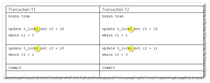 T1在表t_lock1上使用c1=5对所有行保持X锁,而T2对表t_lock2上的所有行保持X锁。 现在,每个事务都希望更新先前被对方锁定的行。这会导致僵局。