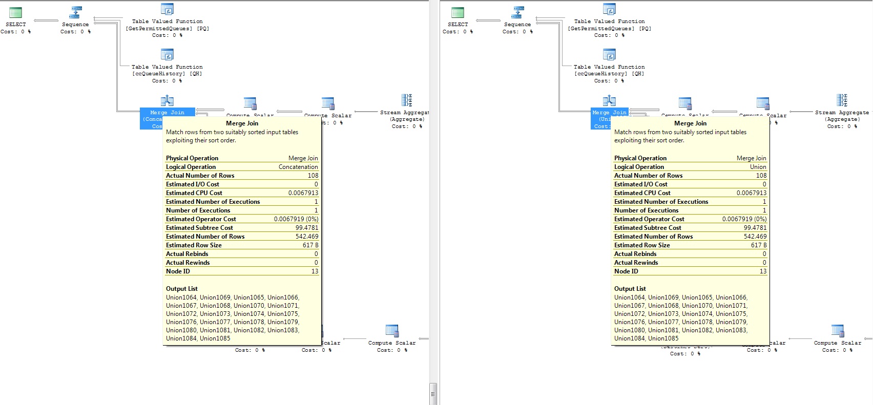 在您的示例中,两个执行计划与物理操作Merge具有相同的步骤(只有逻辑操作不同)。甚至估计也是一样的。
