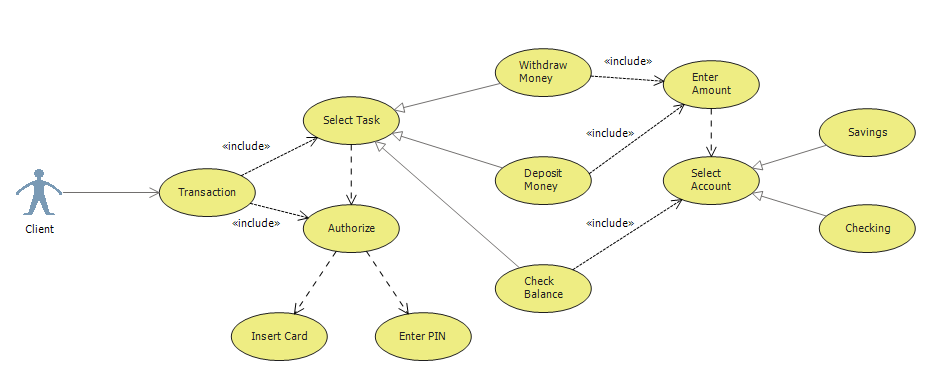 事务处理包括插入卡和输入引脚号,如果该用户获得授权,则只能选择任务。希望这能帮到你..。对于ATM,使用顺序图而不是UML图。