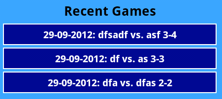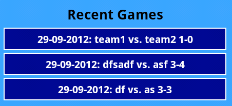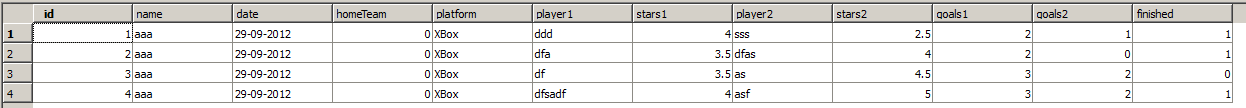 对于我的问题来说,重要的是"id“、"goals1”和"goals2“列。正如你所看到的,最近的三个游戏是"4: dfsadf vs. asf 3-2","3: df vs.as 3-2“和"2: dfsadf vs.dfas 2-0”。在我的活动中,以下内容如下: