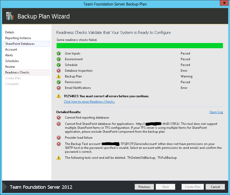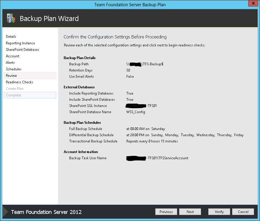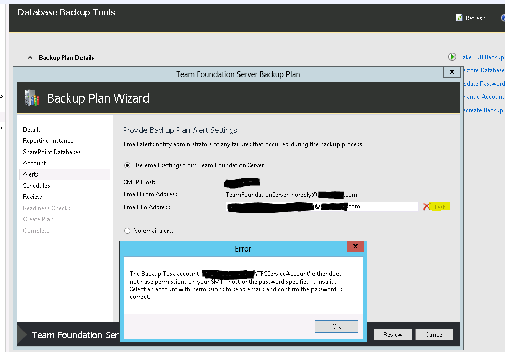 在TFS 2010环境中,我能够使用TFS 2010 Power创建备份计划。我安装/升级了TFS的power工具到TFS 2012电动工具。。当我尝试使用备份计划向导创建备份计划时,会出现错误。(我猜是在升级过程中,数据库的某些权限被撤销了。)