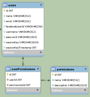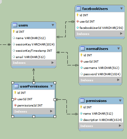 上面的示例用于分离常规用户和Facebook用户(他们最终将访问相同的数据,但登录方式不同)。在第一个例子中,数据显然是分开的。第二个例子要简单得多,但每行至少有一个null字段。如果是正常用户,facebookUserId将为空,而username和password如果是Facebook用户,则为空。