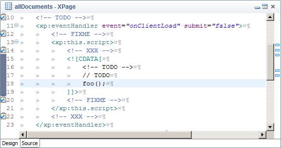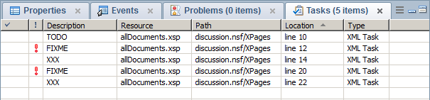 我也想在SSJS中使用它,但我无法使它工作。在Designer首选项常规/编辑/结构化文本编辑器/任务标签,筛选选项卡中,您可以访问“启用搜索任务标签”复选框和勾选XML类型。受影响内容类型部分包含"xsp“,即XP/CC源的文件扩展名。