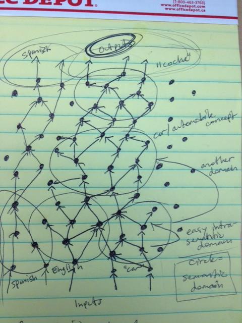 这个模型将容纳一大群相互关联的神经元,如下图所示。少数神经元(图底部)将接收输入信号,级联效应将导致连续的、连接的神经元可能根据信号强度和连接重量而激发。这不是什么新鲜事,但是,没有显式的layers...just越来越远,间接的连接。