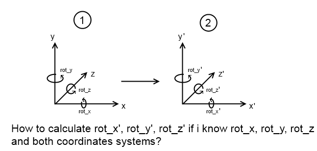 您可以通过应用适当的转换矩阵来转换坐标系之间的旋转。这反过来可以由欧拉角计算,参见维基百科关于转换公式的章节。