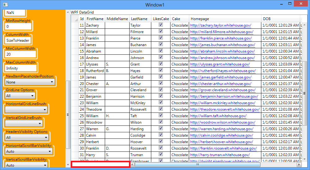 </Grid>此部分定义了DataGrid中的底部滚动条区域。注意到绑定到NonFrozenColumnsViewportHorizontalOffset --该值决定了空左区域的宽度。