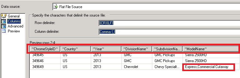 这是CSV文件中的一些行,检查最后一项"~Express,~“,它中包含逗号。