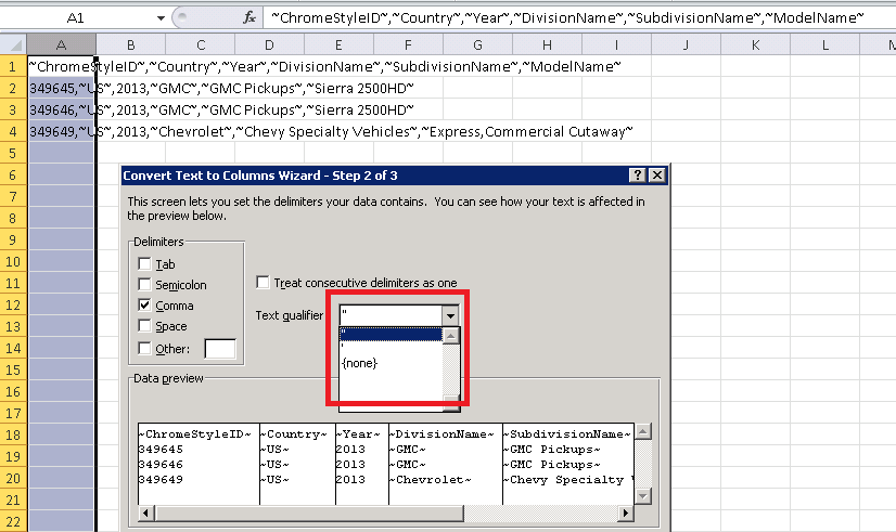 至于Excel,最好将文本限定符替换为双引号或更标准的单引号。事实上,Excel只允许您使用这两个选项,也许有一种方法可以改变这种情况,但我不知道如何更改。
