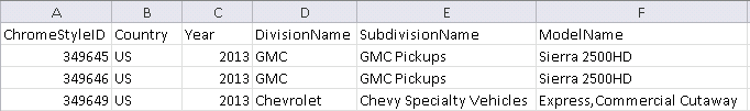 ~ChromeStyleID~,~Country~,~年份~,~DivisionName~,~SubdivisionName~,~ModelName~ 349645,~US~,2013年,~GMC~,~GMC拾取~,~塞拉利昂2500HD~