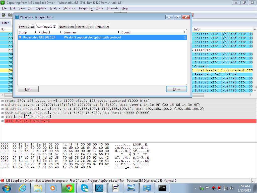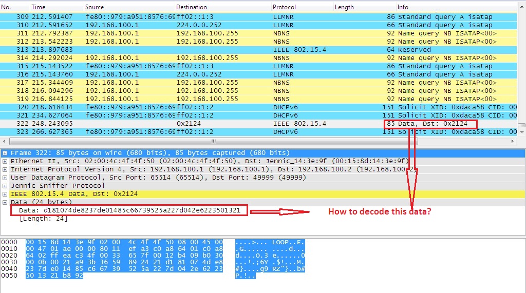 我们使用JN5148EK010节点通过WireShark捕获通信量。所接收的分组显示在所提供的屏幕截图中。