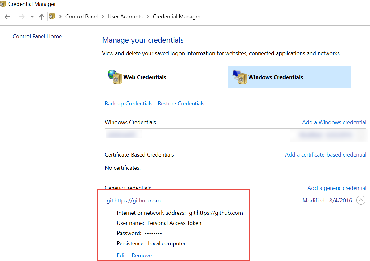 credential.helper=manager每当我执行git push时,它都会使用我很久以前设置的旧用户名,并且我希望使用新的GitHub帐户来推送更改。我后来发现,我的旧GitHub帐户凭据存储在控制面板、→、用户帐户、→凭据管理器、→管理Windows凭据下。