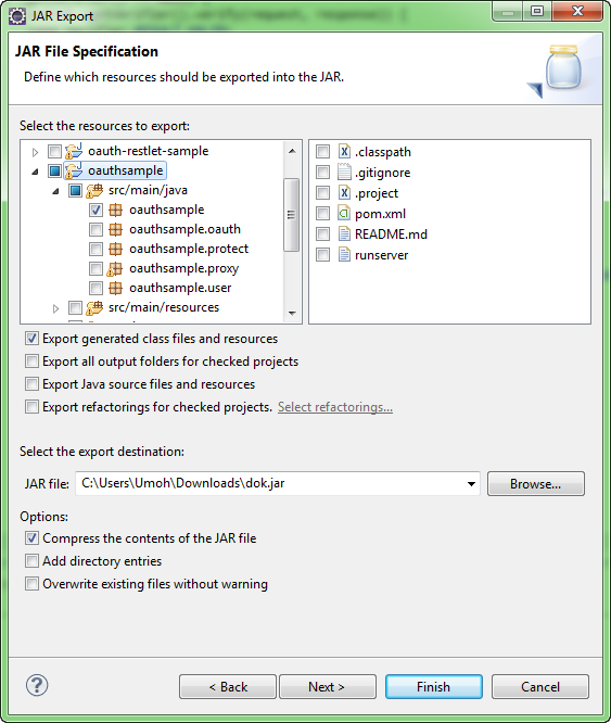 @trideceth12 12我刚刚测试了在eclipse中导出一个示例包。我的文件夹结构也很好。不知道你的为什么不能正常工作。您应该检查所有导出设置。这是我的样子,出口很好。