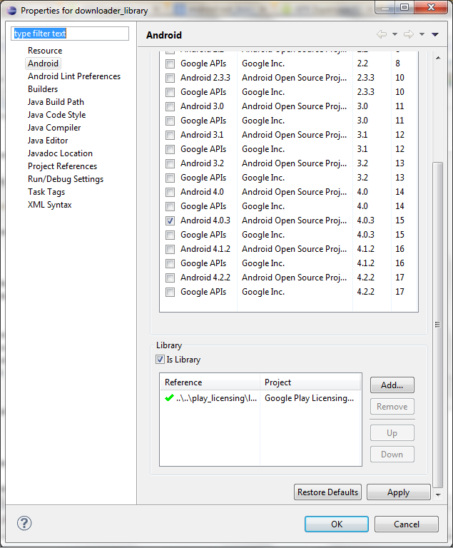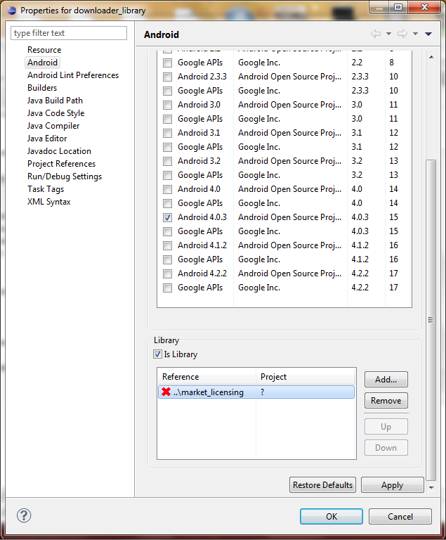 为了纠正这个问题,我不得不删除我导入的下载程序库,然后使用Android管理器卸载"Google扩展库“,然后重新安装它。然后在eclispe中重新导入下载程序库,然后“右键单击”下载程序项目,删除错误的库“market_licensing”,并添加正确的库“play_licensing”。