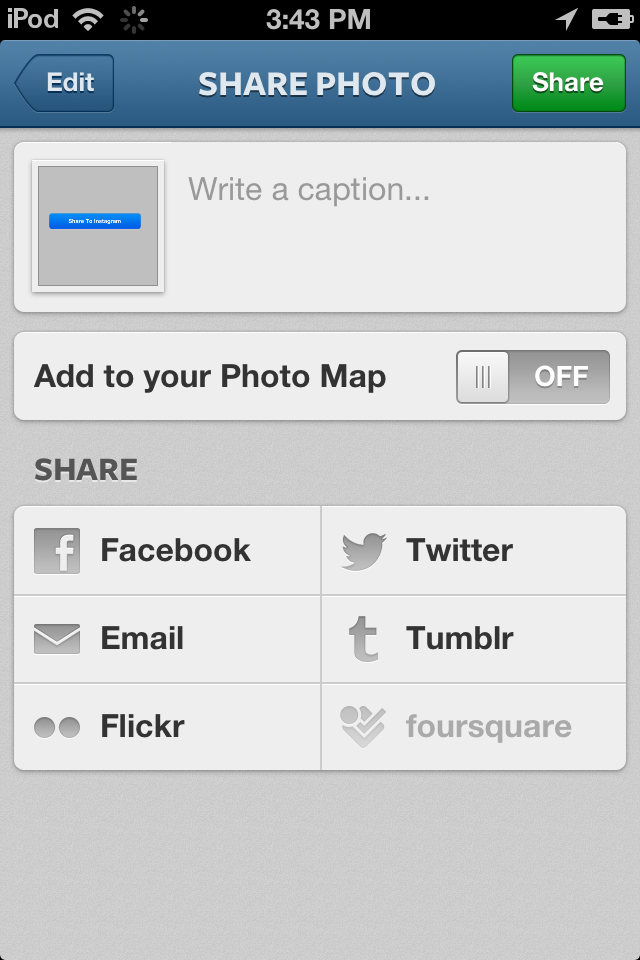 若要在照片中包含预填充的标题,可以将文档交互请求上的注释属性设置为包含“NSDictionary”键下的NSString的注释属性。注意:此功能将在Instagram 2.1及更高版本上提供。