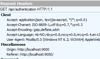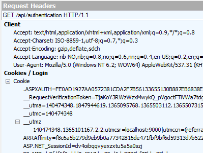 我们用Fiddler来调试。当我们访问API上需要直接在浏览器中进行身份验证的控制器时,我们可以确认用户确实经过了身份验证。当我们执行XMLHttpRequest时,就像怀疑的那样,没有在标头中发送身份验证cookie。
