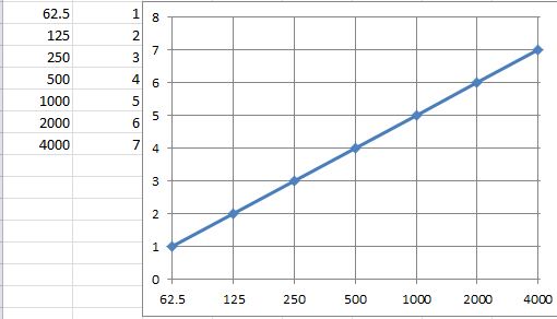 我想在Excel 2007中创建一个1/3的八度波段图,但我找不到方法。Excel只允许我把'x‘轴变成对数轴,但是1/3倍频程波段的标度不是这个。