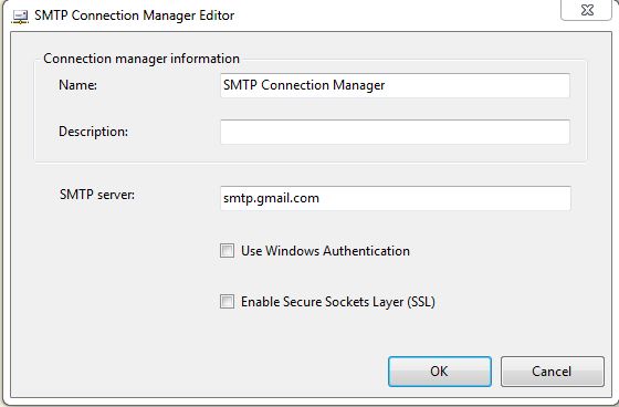 而且,您无法通过Windows身份验证连接到GMail,因此您必须使用脚本组件并在.Net中这样做,如果这必须是您的邮件服务器的话。