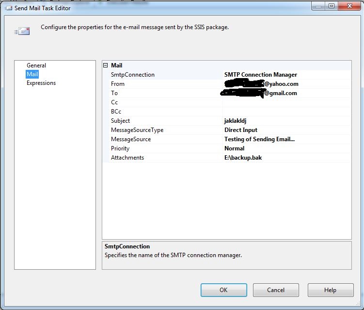 下面是我的SMTP连接管理器和发送邮件任务,上面的错误发生了。