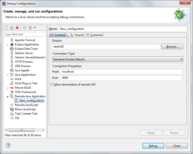 然后,您只需在Eclipse的Debug配置中为您的项目配置一个远程Java应用程序概要文件,并将其指向同一个jpda端口。