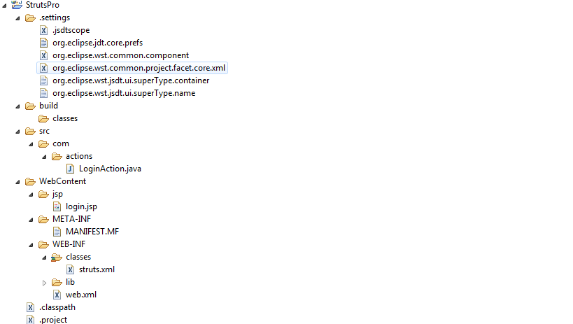我有一个Struts 2项目,其目录结构如下。但是当我试图在Tomcat 7上使用Eclipse运行这个项目时,它会给我带来404错误。