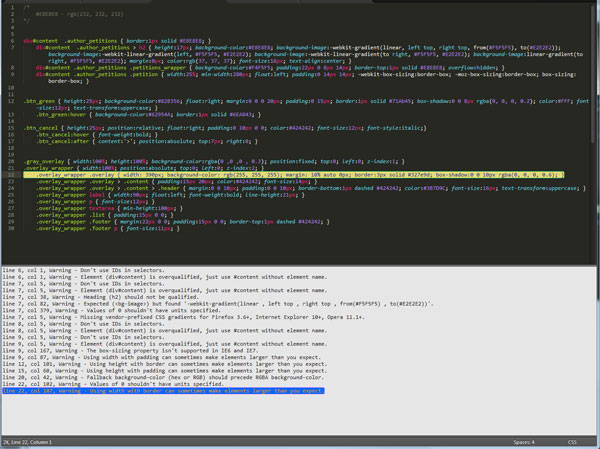 另外,我更喜欢使用SublimeLinter。它包括cssLint,并且有一组相当健壮的设置选项。您可以在这个问题上找到有关此插件的更多信息。